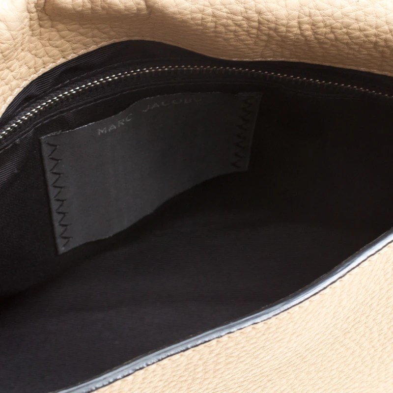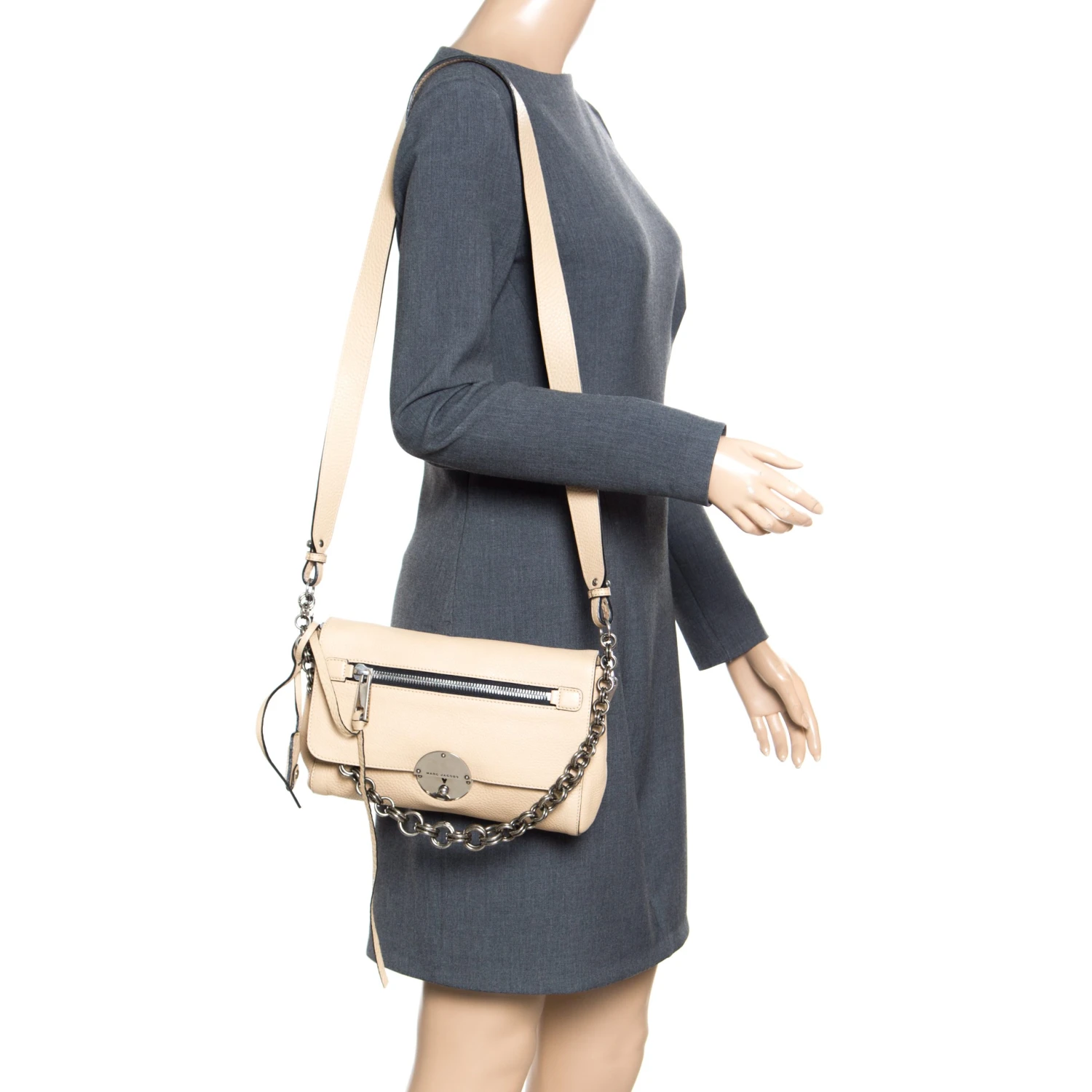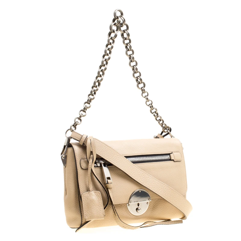 This Marc Jacobs shoulder bag is small and statement-making. Made from beige pebbled leather, it is accented with silver-tone hardware. It features a zipped pocket and push-lock on its front flap along with a detachable shoulder chain strap. The fabric-lined interior comes with a zipped pocket.