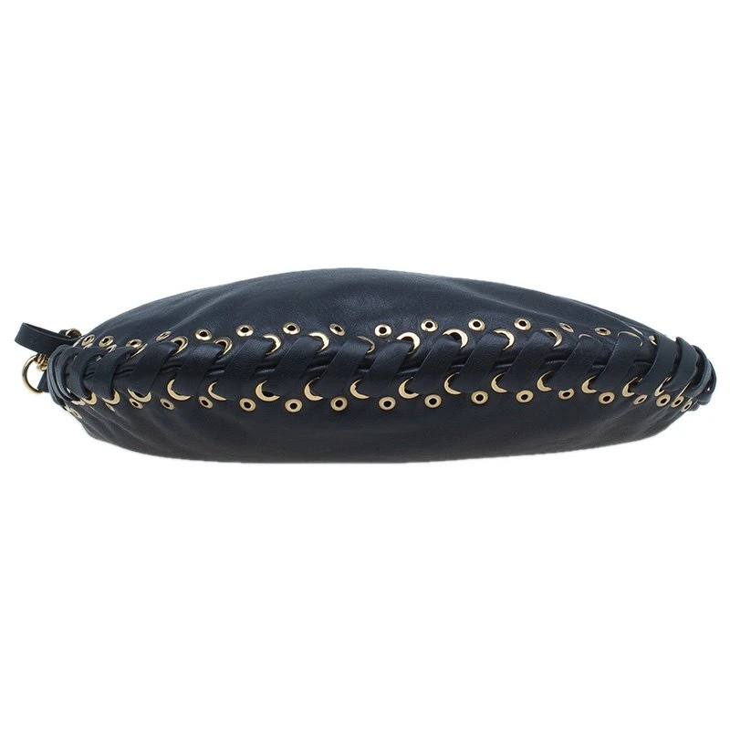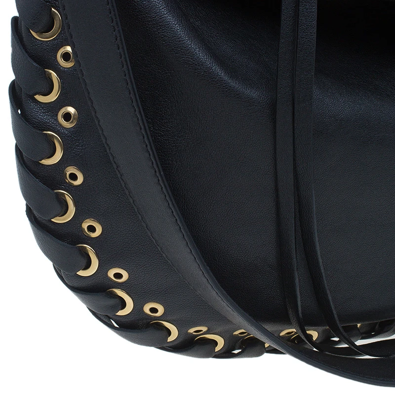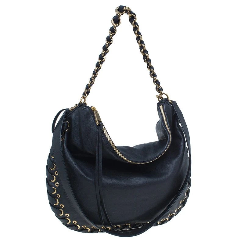From the Spring 2014 collection, this Marc Jacob hobo is just beautiful. Crafted from black leather, it features laced-up leather sides and two ways to carry. It comes with gold-tone chain strap and a leather strap. Secured with a zip closure, the interior is fabric lined and has a zipper pocket.