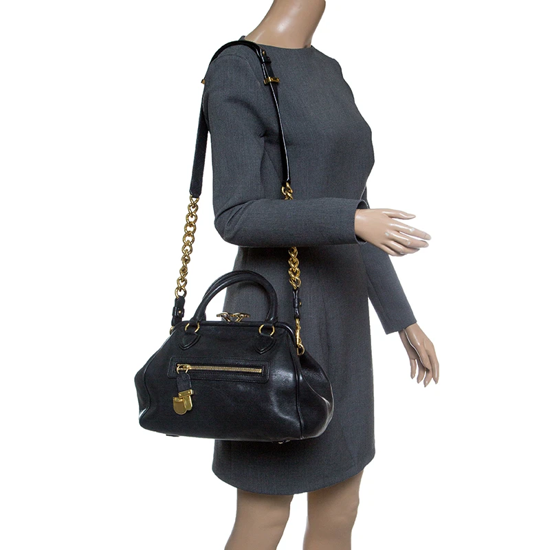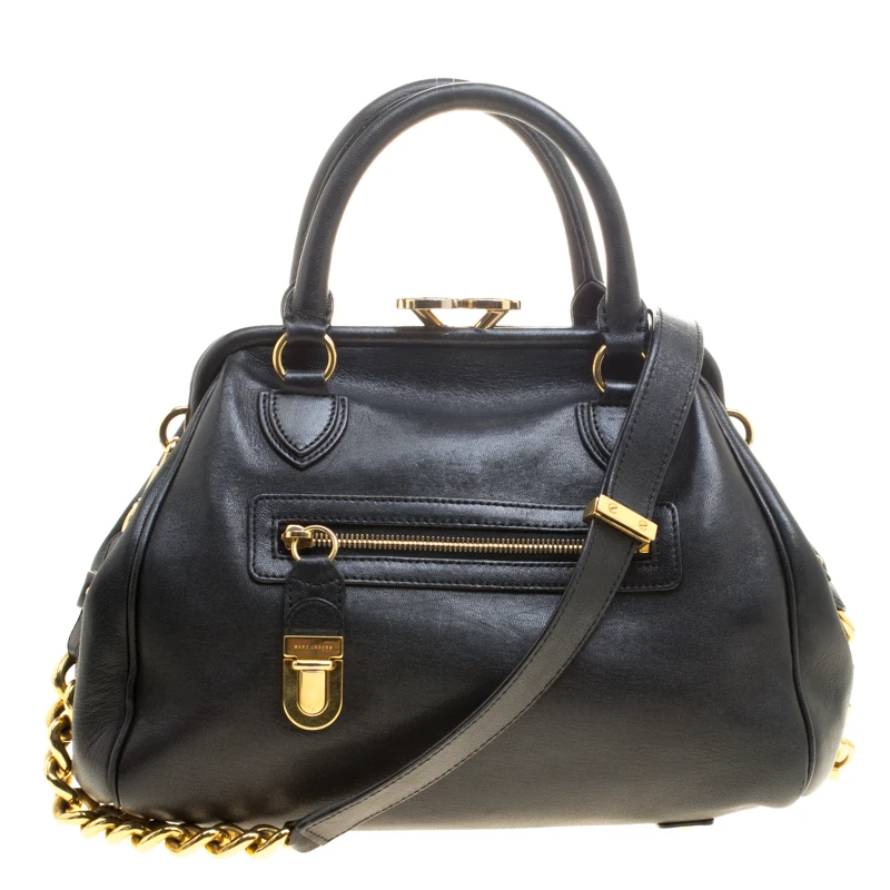 This Marc Jacobs Stam satchel is crafted from leather and features black exterior. The bag has a kiss lock closure, dual handles, a front zip pocket, protective metal feet and a detachable chain strap with leather shoulder rest. The canvas lined interior houses a slip pocket to keep your essentials safe.