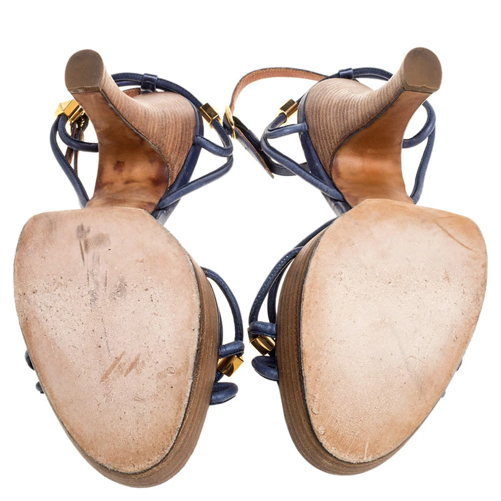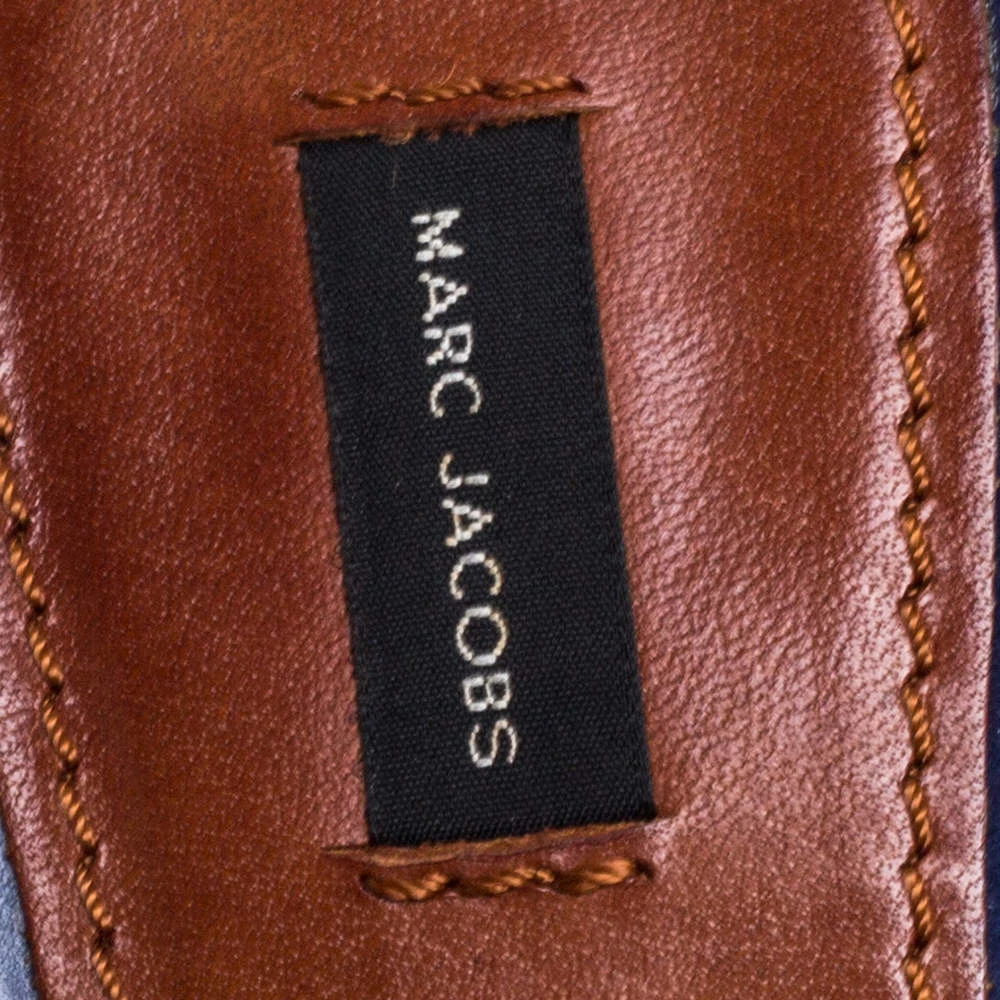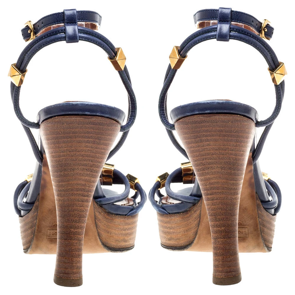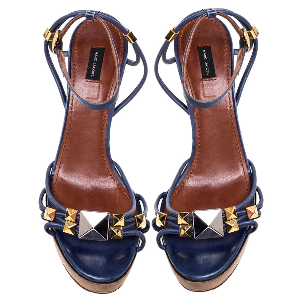 These sandals from Marc Jacobs are a perfect blend of fashion and comfort! They feature blue leather straps, gold-tone studs, and buckle ankle closure. Leather-lined insoles, 13 cm heels, and platforms ensure an elevated walk.