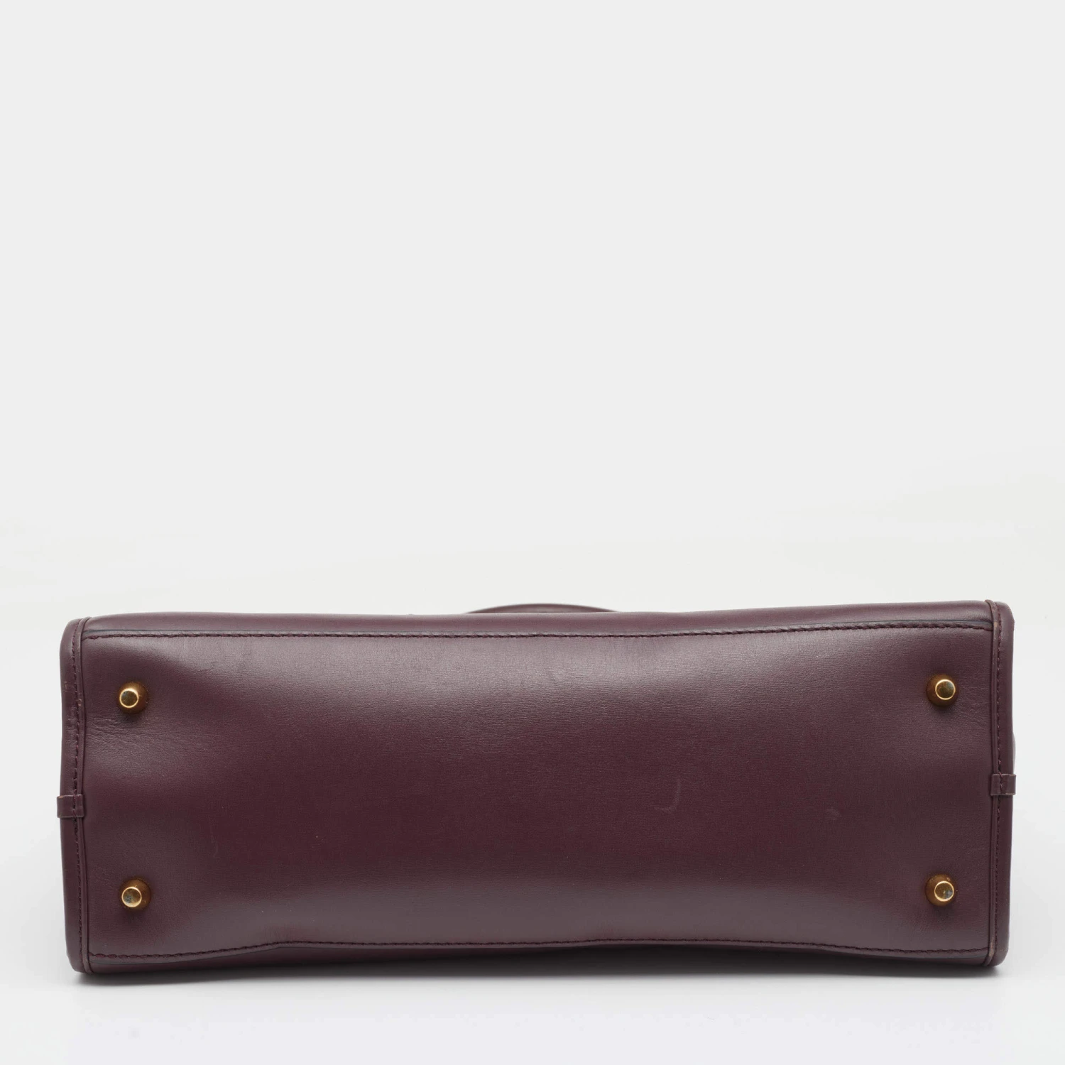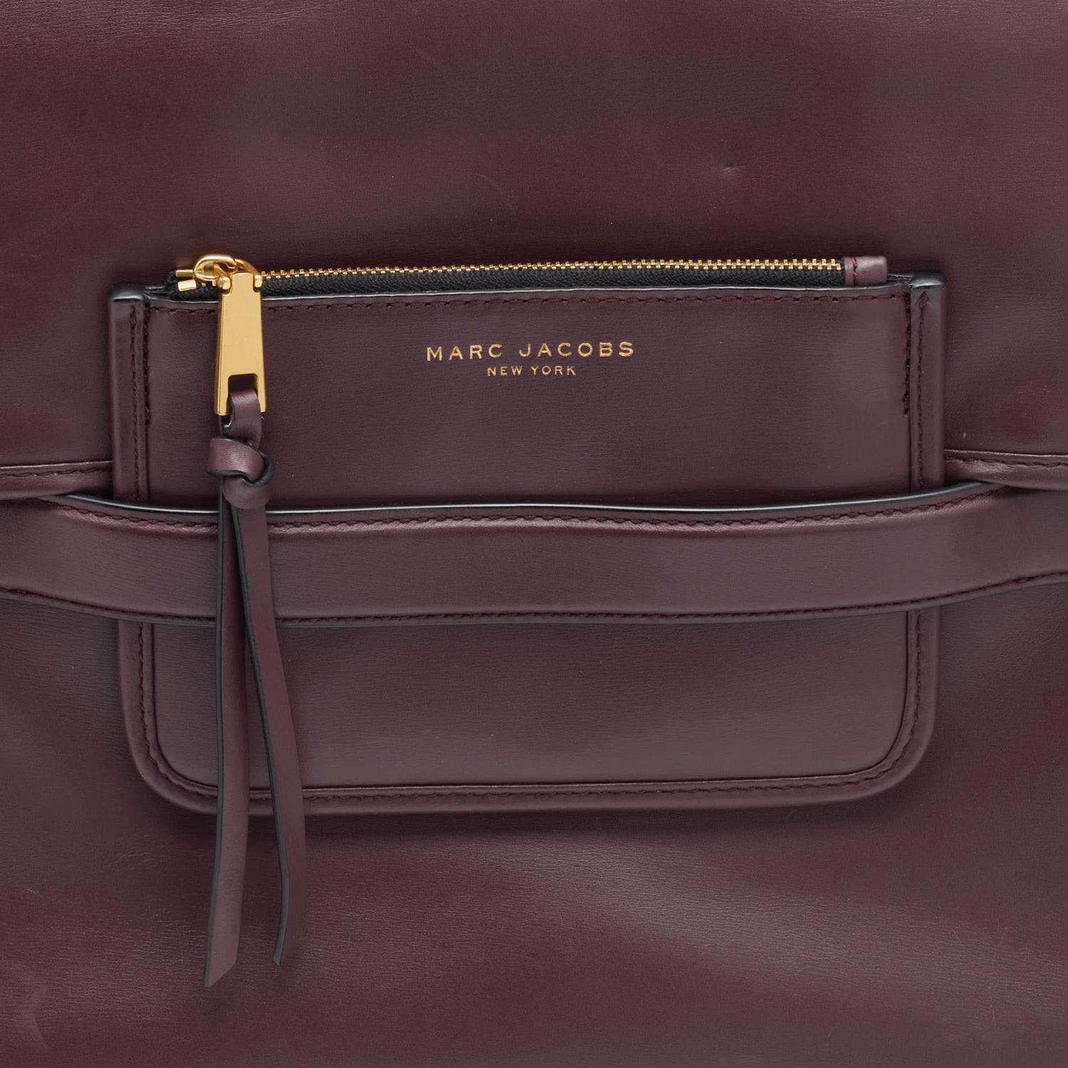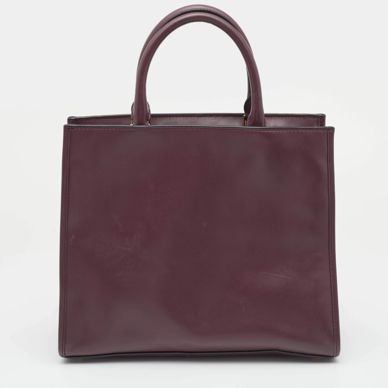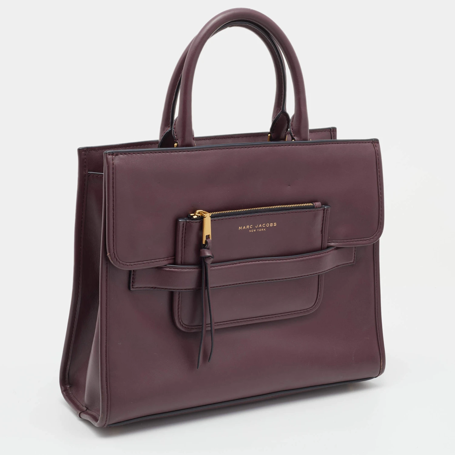 Lightweight, durable, and chic, this Marc Jacobs tote is perfect for everyday use. It features a burgundy leather body detailed with a zip pocket on the front. It opens to a spacious fabric interior. Complete with dual top handles, this well-structured bag flaunts the brand logo on the front.