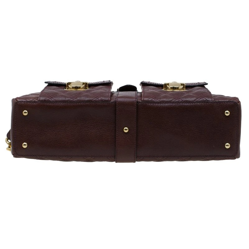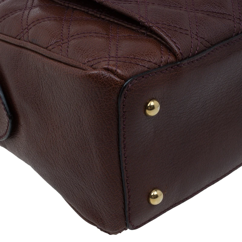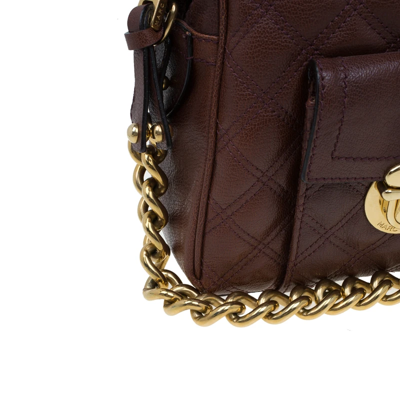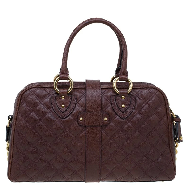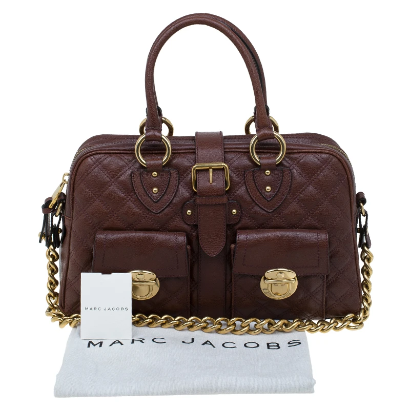 Practical and opulent, this Venetia Satchel by Marc Jacobs has set a functional and style accent in one bag. Crafted with leather, it is accented with quilted details, studded bottom and gold-tone hardware. It features dual top rolled handles and an impressive chain entwined shoulder strap. The two front push-lock pockets gives it a phenomenal look. Lined with fabric, the belted buckle closure features a zipper pocket.