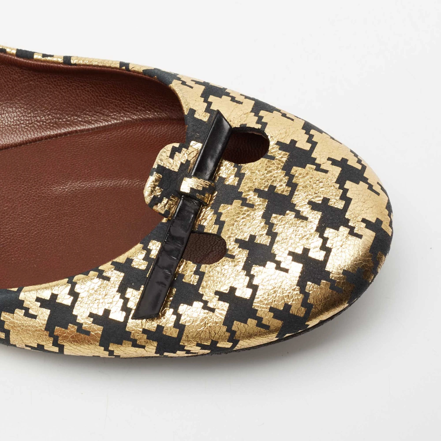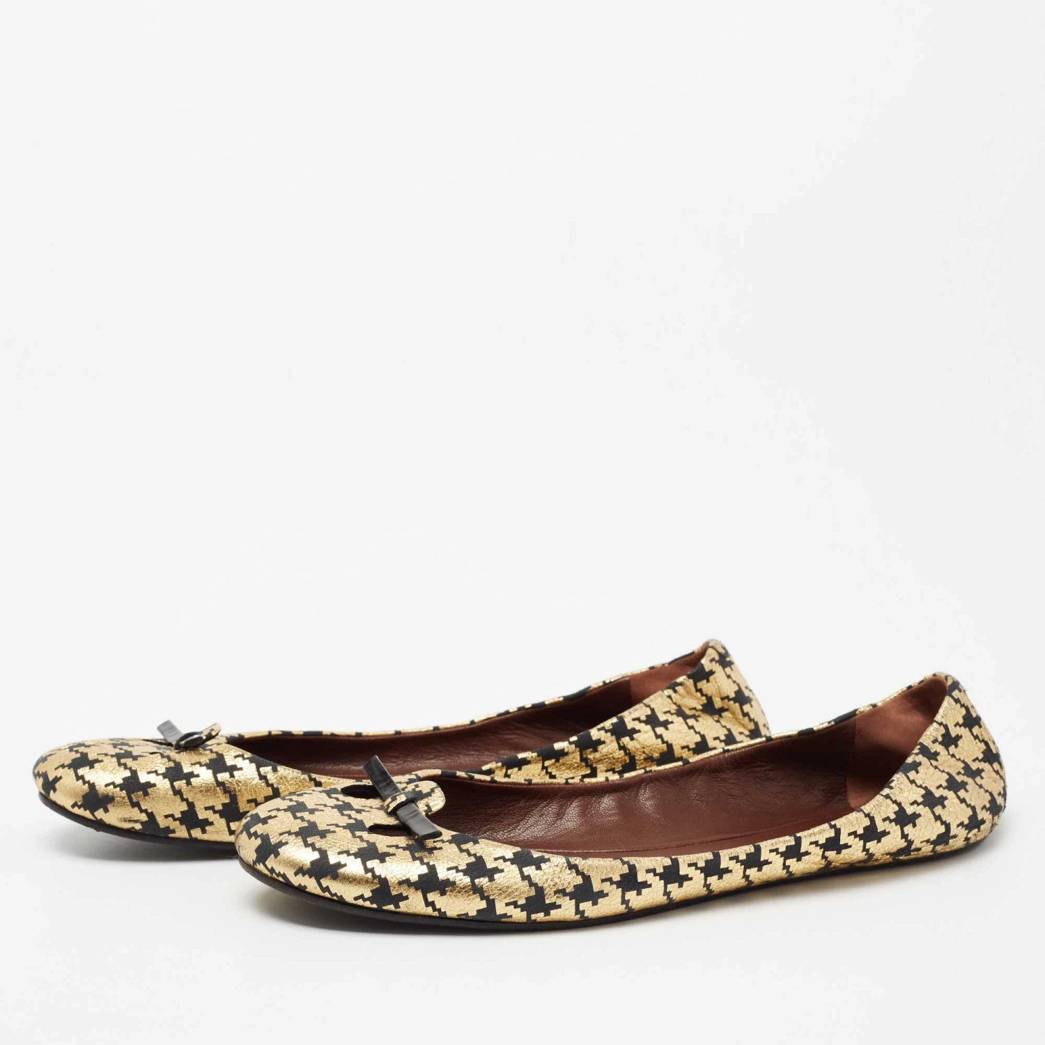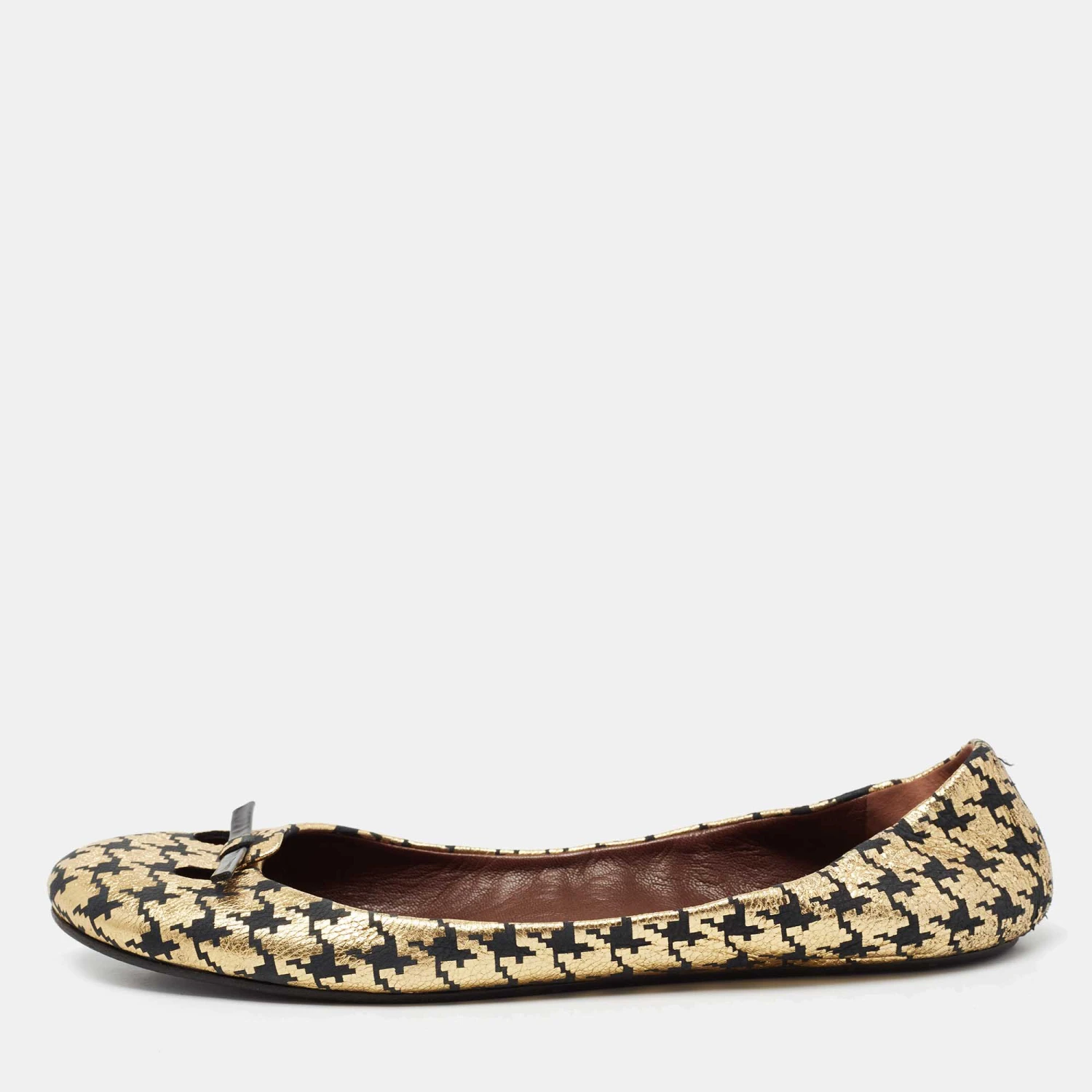 These stunning ballet flats by Marc Jacobs are absolute must-haves. They are crafted from Houndstooth print suede and come in shades of black and gold. The glamorous flats are styled with rounded toes, pretty bow detailing, and durable leather soles.