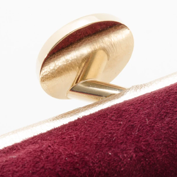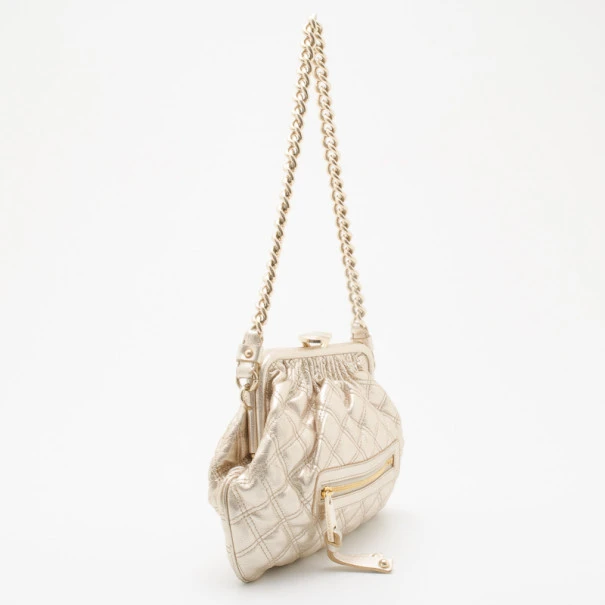 Add this Metallic Pale Gold Little Stam by Marc Jacobs to your wardrobe every time you’re looking for a polished and glamorous look. This mini version of the popular handbag is crafted from metallic gold colored quilted stitch leather that is detailed with a thick gold chain-link shoulder strap, a gold kiss lock, gold hardware and a front zip pocket. The interior is lined with burgundy suede and features a zip pocket with a Marc Jacobs gold label.Original Retail Price: US $795Condition: Like New (This bag is in very good condition with negligible signs of use)Dimensions: 22 CM(H) 41 CM(L) 4 CM(W)Handle Drop: 19 CM (Distance between handle and top of the bag)Material: Leather Exterior, Suede InteriorHardware: Gold-toneIncludes:Â The Luxury Closet Dustbag