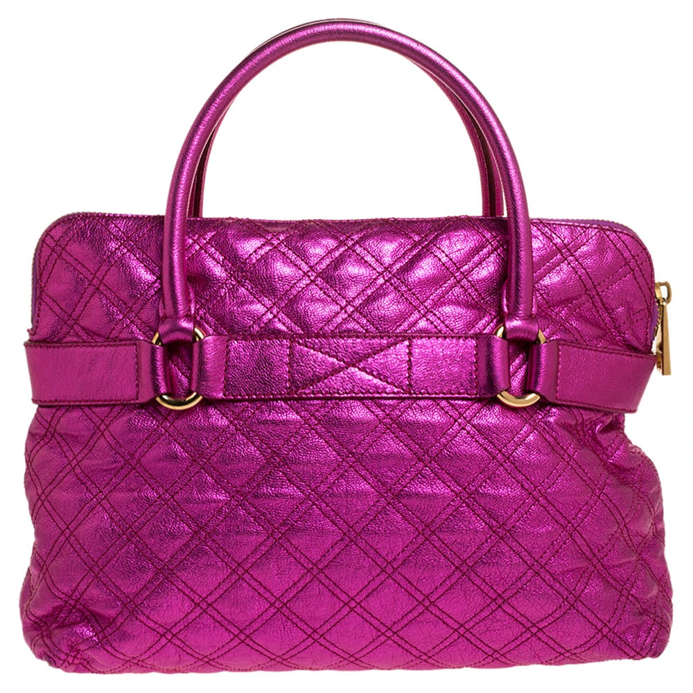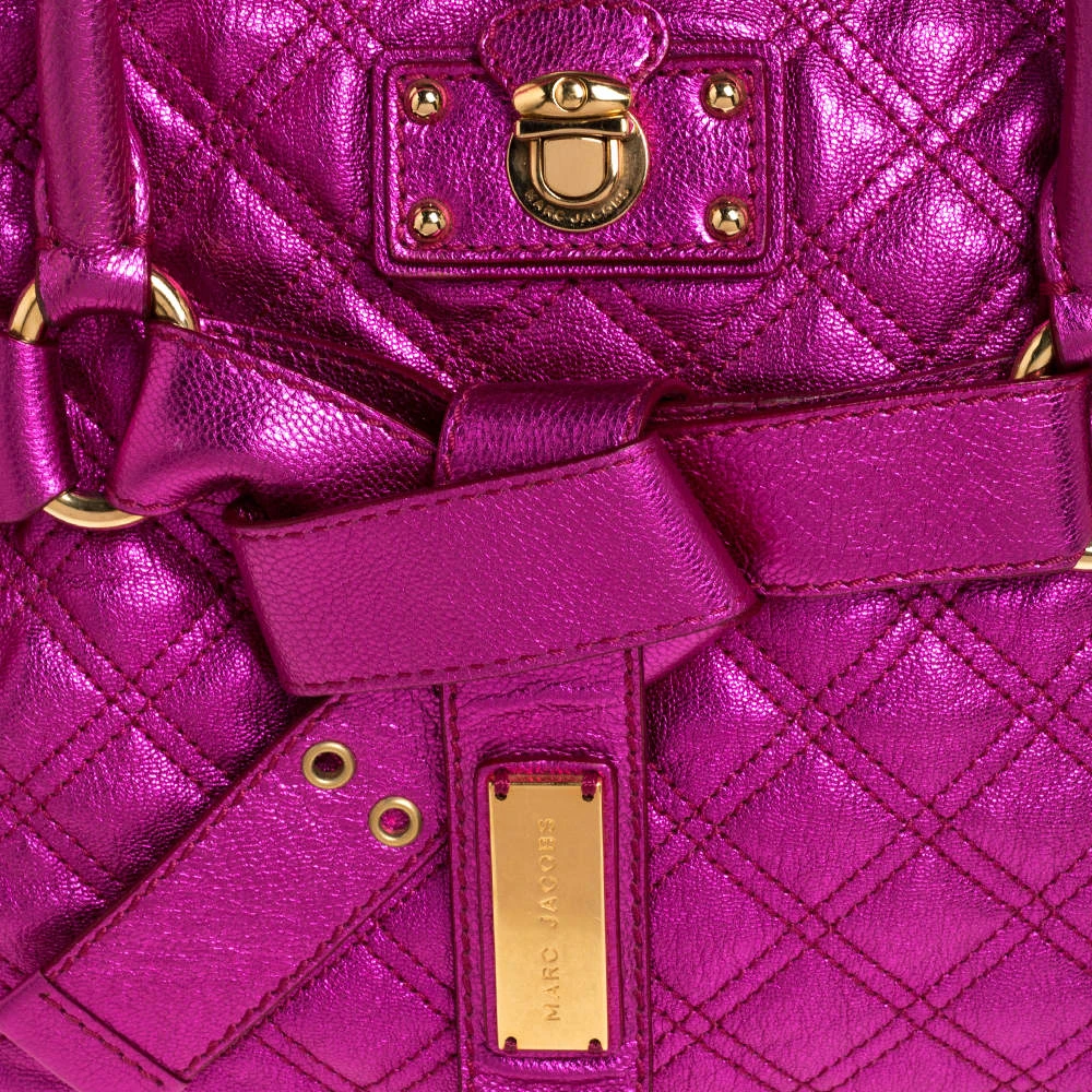 Make a fashion statement with this Marc Jacobs metallic pink quilted leather satchel and turn heads everywhere. It features a cute bow in the front with gold-tone buckle and hardware detailing, and a spacious fabric interior secured with a zipper. It also has rolled leather top handles and an interior zip pocket.