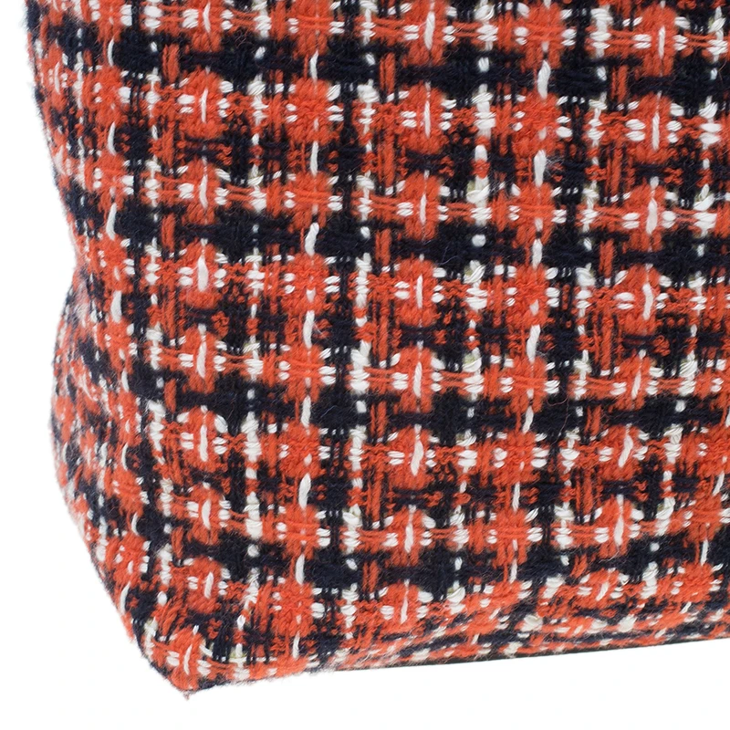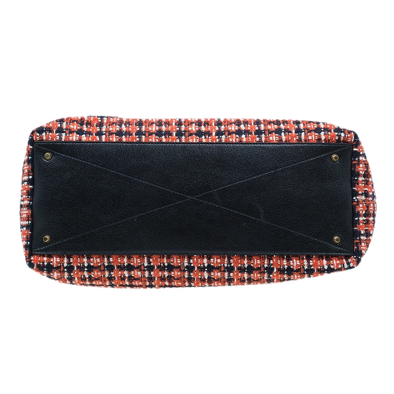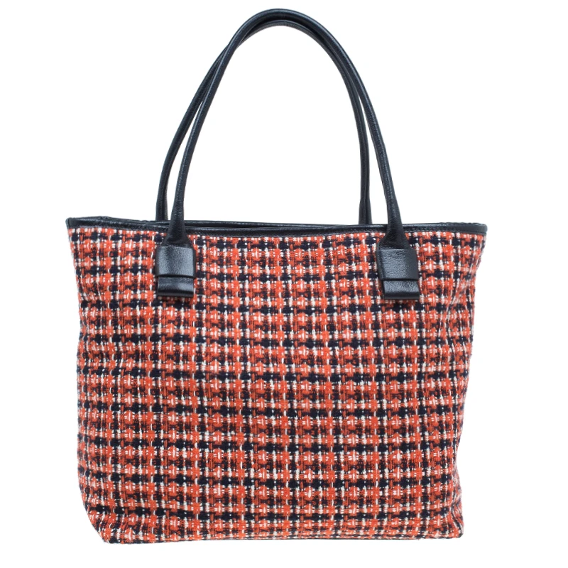 Striking and unique, this Marc Jacobs tweed tote will add character to any ensemble! Crafted from orange tweed with black and white in the weave, the bag features black leather trim on the top, leather handles, designer logo at front and four feet at the leather base. The wide interior opens with a snap closure and houses two open and one zipper pocket.