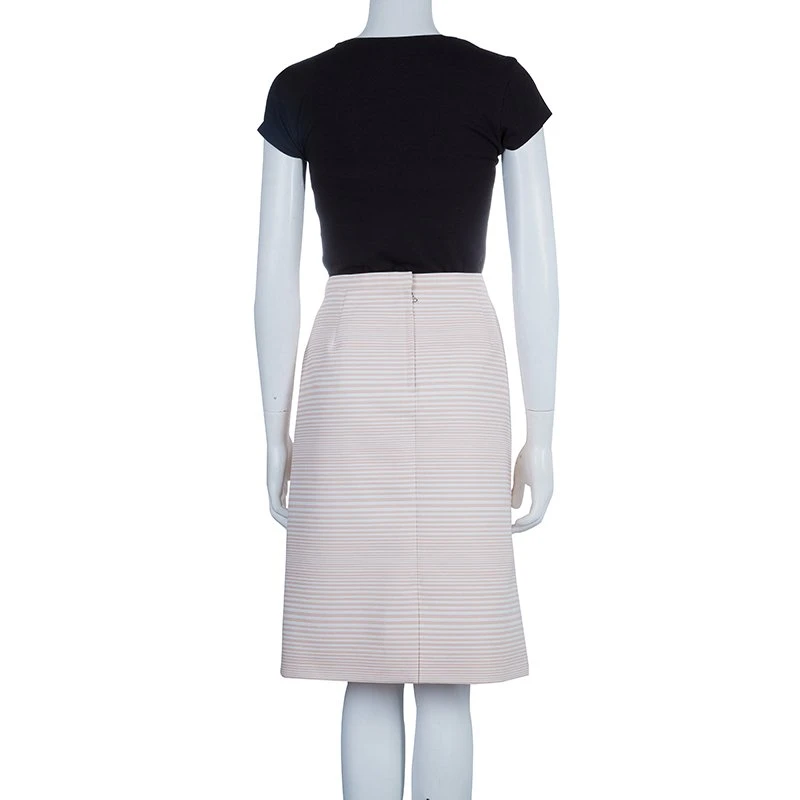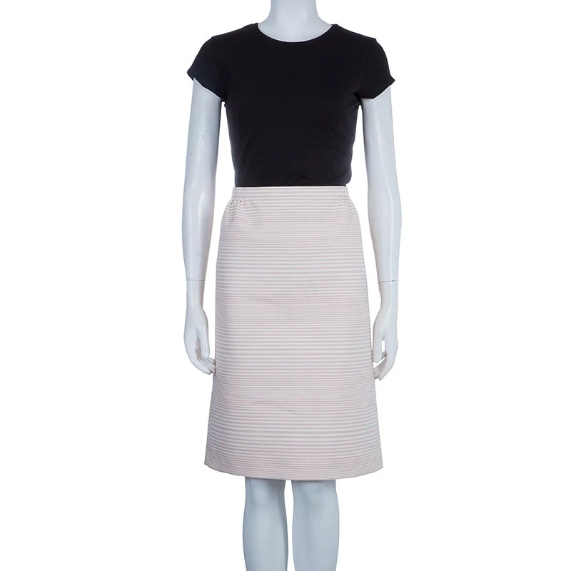 Look fashion forward and chic in this Marc Jacobs skirt. Crafted in peach cotton and polyester blend, this skirt is perfect for an office wear or for an everyday wear. Tailored in a straight fit, it has a striped pattern allover, has pleats from rear and is equipped with a zip fastening.