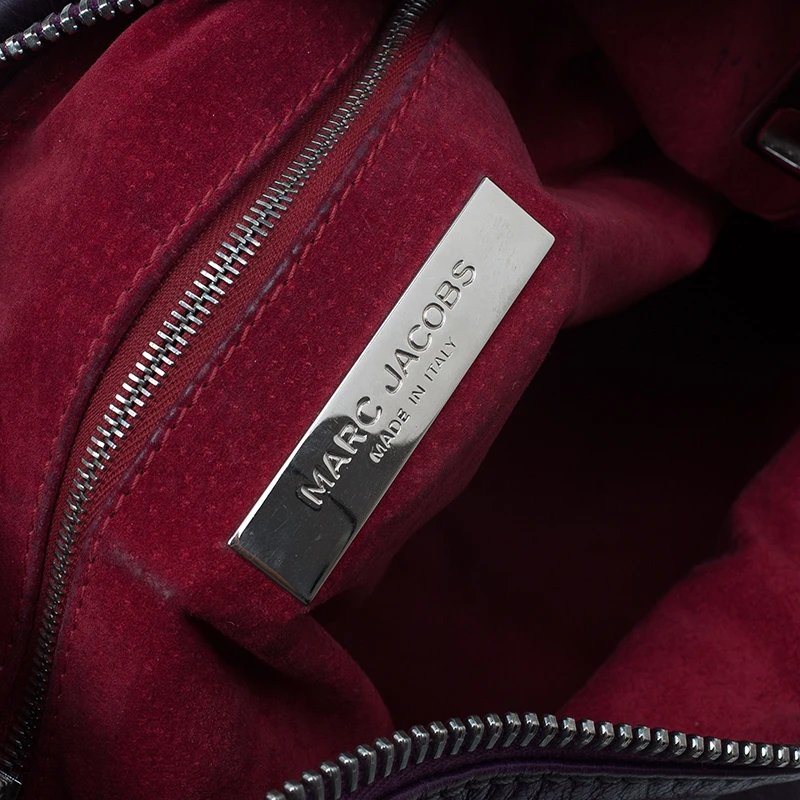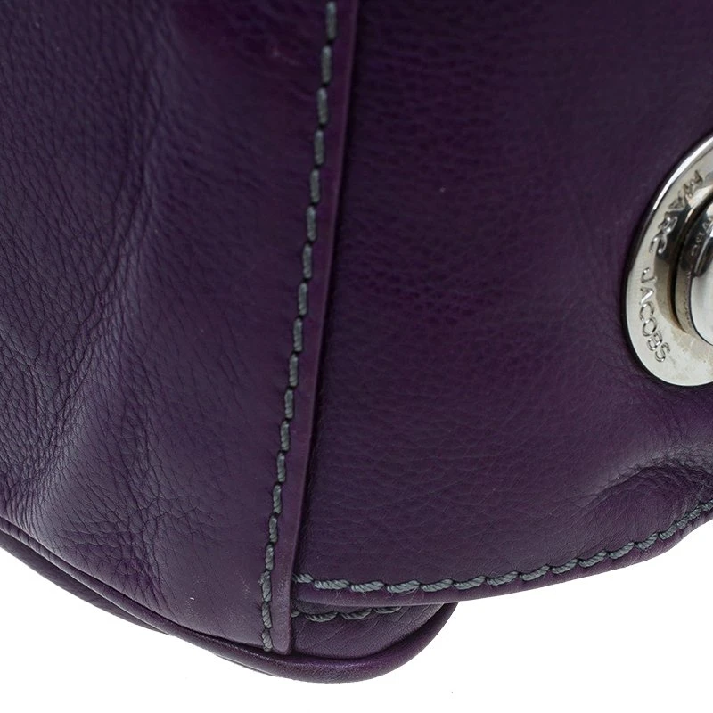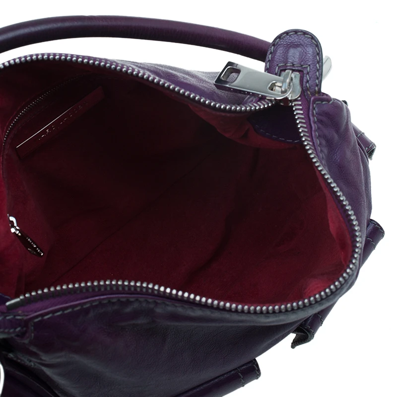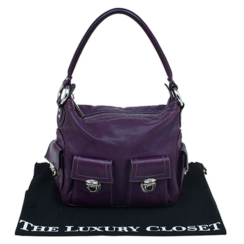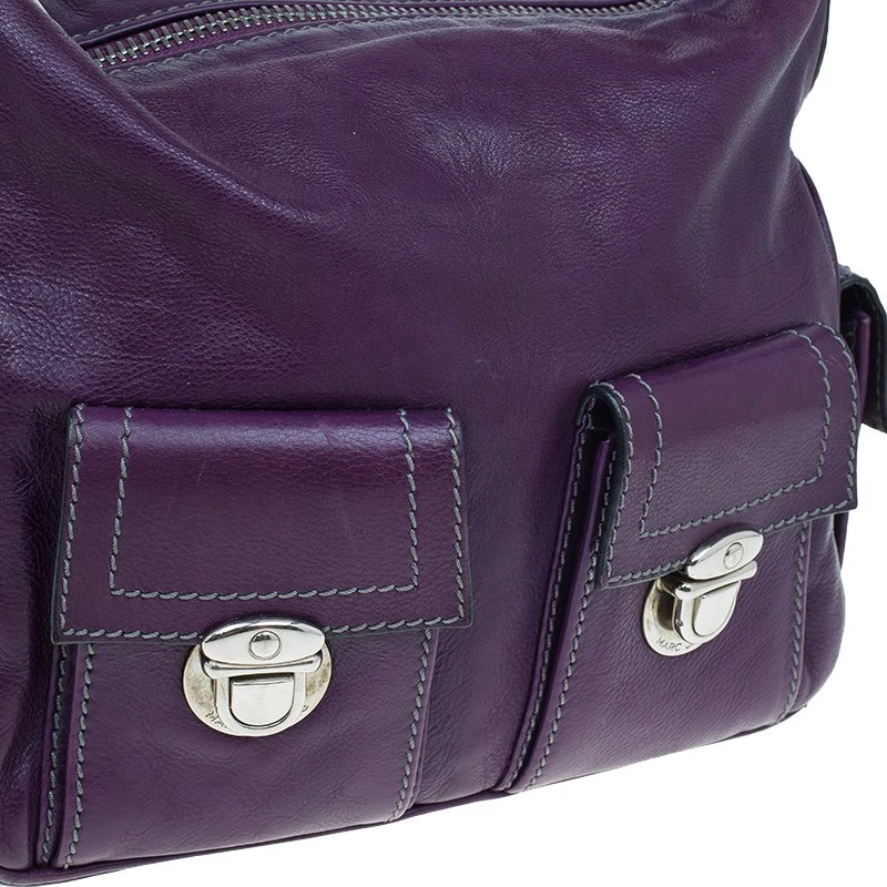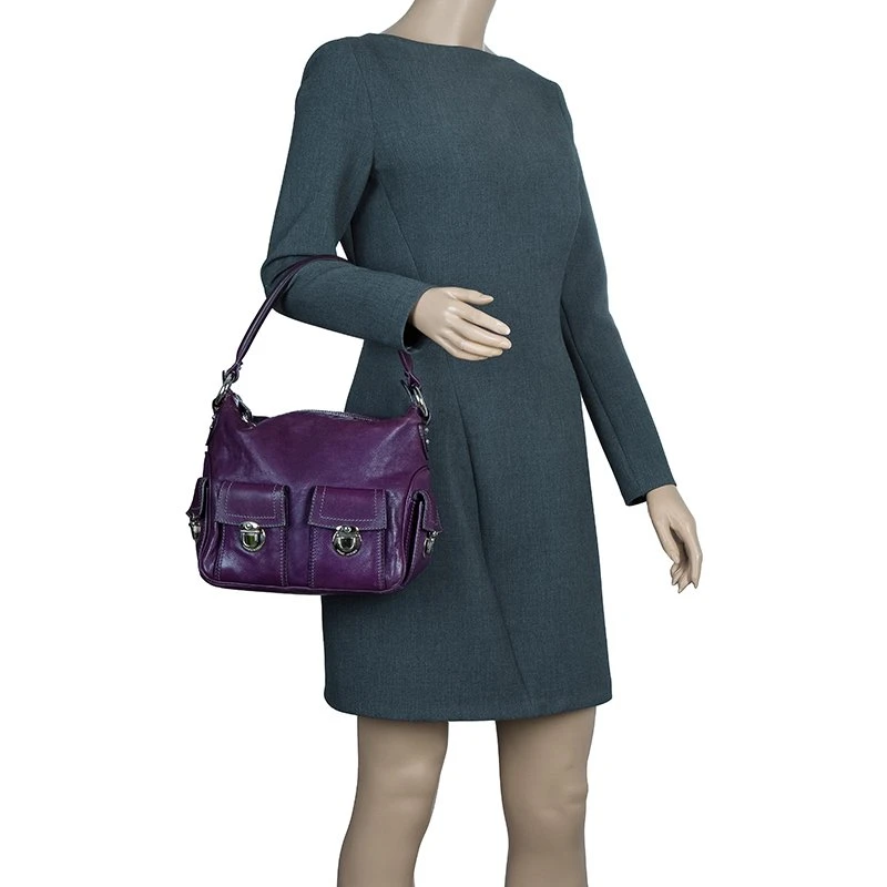 This Marc Jacobs hobo is apt to carry everyday essentials in an organized and easy to access manner. Crafted from purple colored leather, the bag is provided with silver-tone hardware. It features a tubular handle, four pockets with push button fastenings, and a zip closure. The suede lined interior houses a zip pocket.
