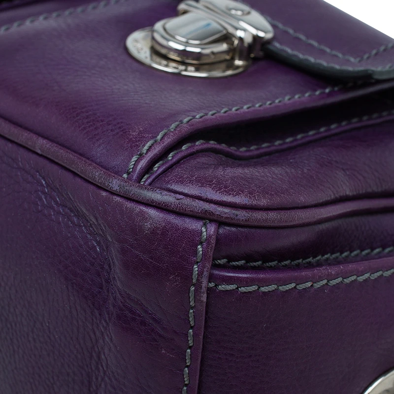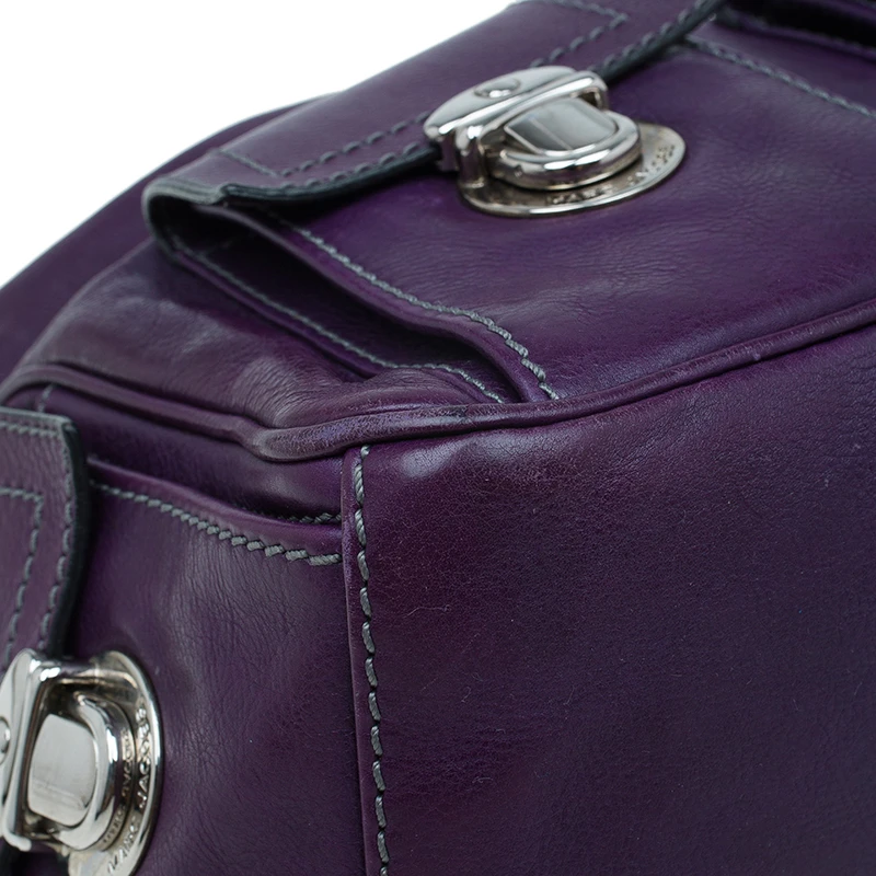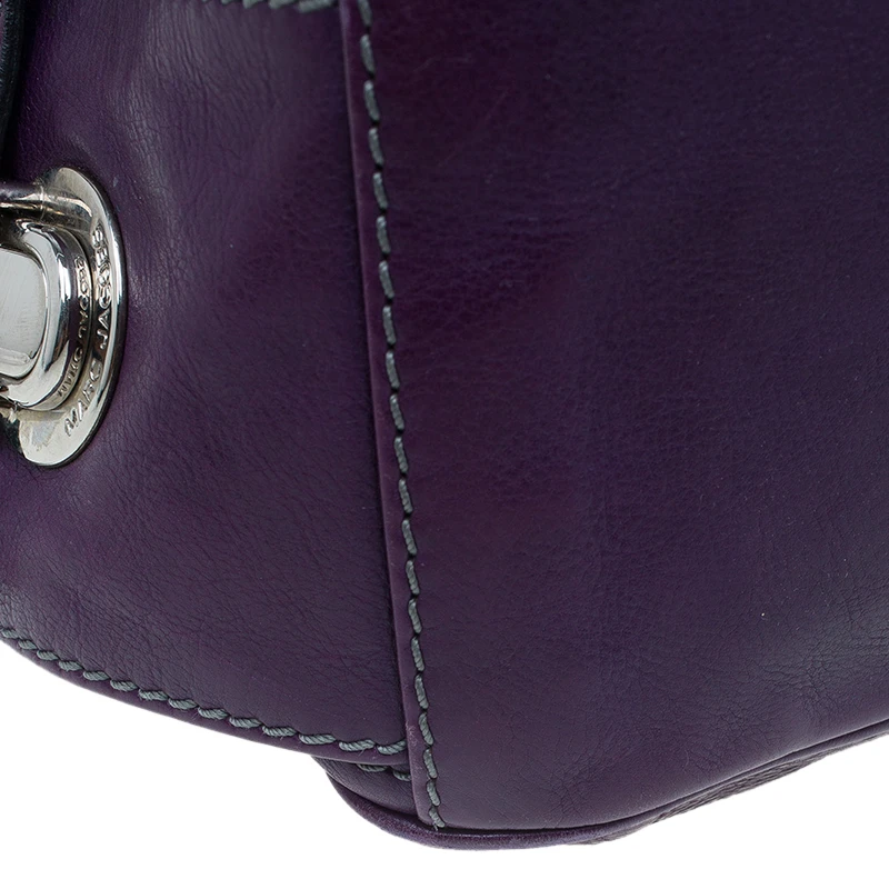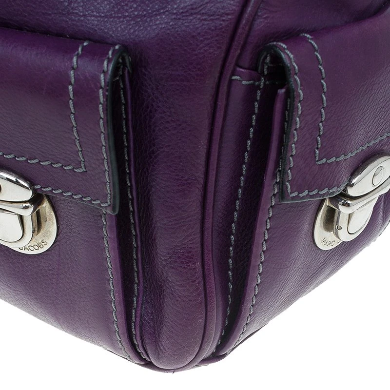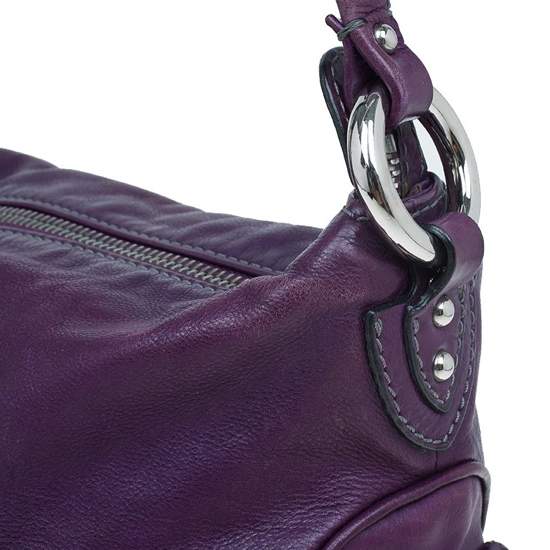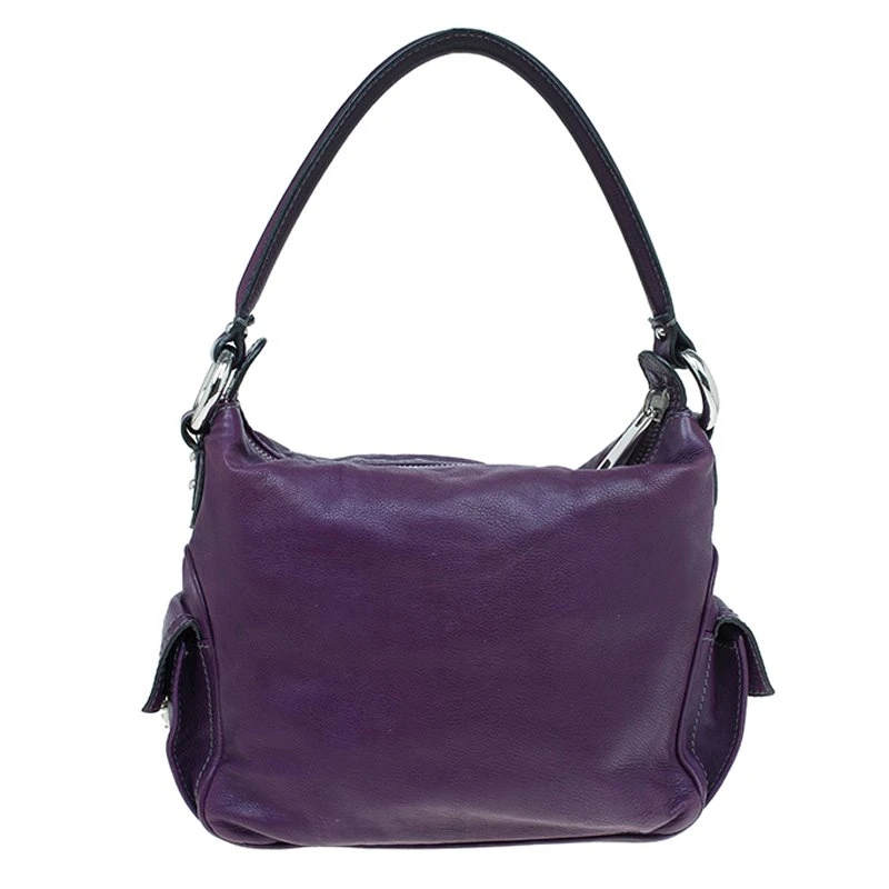 This Marc Jacobs hobo is apt to carry everyday essentials in an organized and easy to access manner. Crafted from purple colored leather, the bag is provided with silver-tone hardware. It features a tubular handle, four pockets with push button fastenings, and a zip closure. The suede lined interior houses a zip pocket.