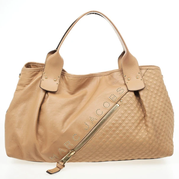 This chic tote by Marc Jacobs is crafted from smooth and quilted tan leather. It is equipped with double flat leather handles. The front houses the Marc Jacobs brand name in gold-tone studs. The interior is lined with canvas and features one zip pocket and one patch pocket.Original Retail Price:US $995
