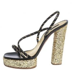 Marc Jacobs Black/Gold Leather And Glitter Fabric Slingback Platform Sandals Size 40 For Women