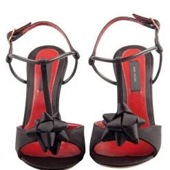 Marc Jacobs Black Satin And Leather Trim T Strap Flower Detail Open Toe Sandals Size 36 For Women